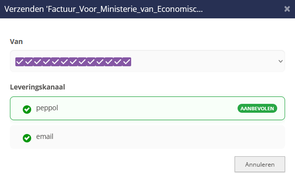 Vanaf het eConnect-platform kunnen facturen verstuurd worden naar de Nederlandse overheid (Voor Belgische overheden gelden andere verzendopties). Op dit moment kunnen alleen Nederlandse organisaties, die bekend zijn bij de Nederlandse Kamer van Koophandel, via de zoekoptie gevonden worden. Debiteuren die geen KvK nummer hebben zoals sommige overheidsinstanties dienen handmatig ingevoerd te worden via Adres handmatig invoeren.