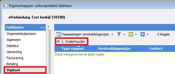De verstrekkingswijze ‘eVerbinding (UBL)’ stel je in op het tabblad Digitaal. Ook is het KvK-nummer of Bedrijfs-ID eConnect van de verkooprelatie nodig. Eén van deze velden is verplicht bij de verzending via eConnect. "eVerbinding" is de oude naam van eConnect. Sommige softwarepakketten van derden gebruiken nog onze oude naam. Waar u eVerbinding ziet staan wordt dus eConnect bedoeld.