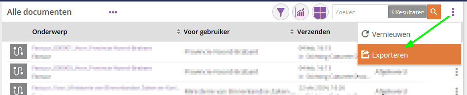 Het is mogelijk om overzichten van je documenten vanuit het platform te exporteren naar een CSV-bestand, om dit te kunnen inlezen en/of verwerken in een ander programma. Vanuit iedere Weergave heb je de beschikking over de functie "Exporteren". Je exporteert daarmee alle gegevens die je in die Weergave ziet, met een maximum van 20.000 regels.