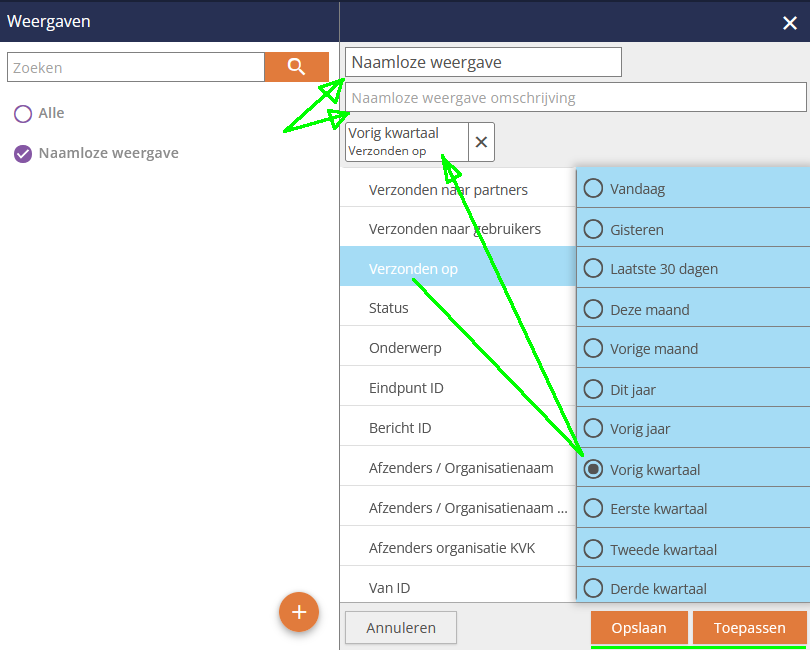 In alle weergaven van documenten zoals Postvak in/uit, alle apps, transactie overzichten, etc. kan worden gefilterd met specifieke zoektermen die ook kunnen worden opgeslagen voor later gebruik. Door op de filter/trechter ("Weergaven") te klikken... ...