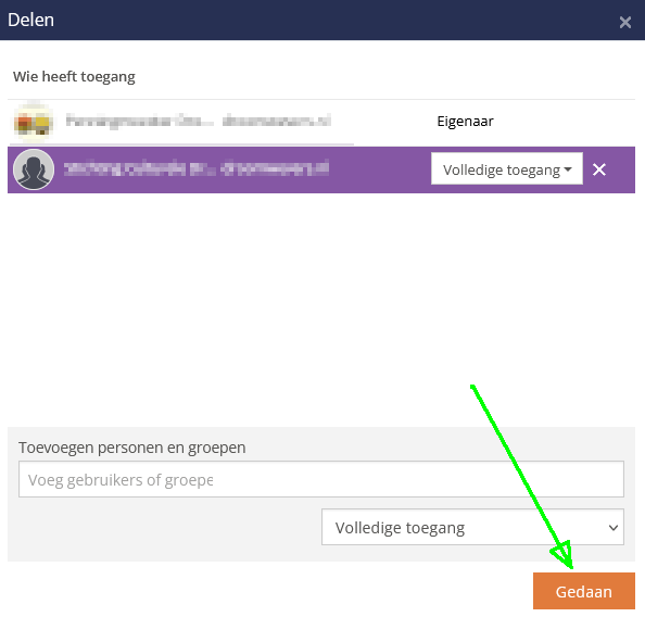 Klik op "Opslaan" om hem voor later gebruik te bewaren en/of op "Toepassen" om hem direct te gebruiken. Als je ervoor kiest om hem op te slaan, verschijnt ook de knop "Delen", waarmee je dit filter eventueel ook beschikbaar kunt maken voor collega's. Selecteer de collega('s) met wie je hem wilt delen, geef aan wat ze ermee mogen doen, en klik op "Gedaan".